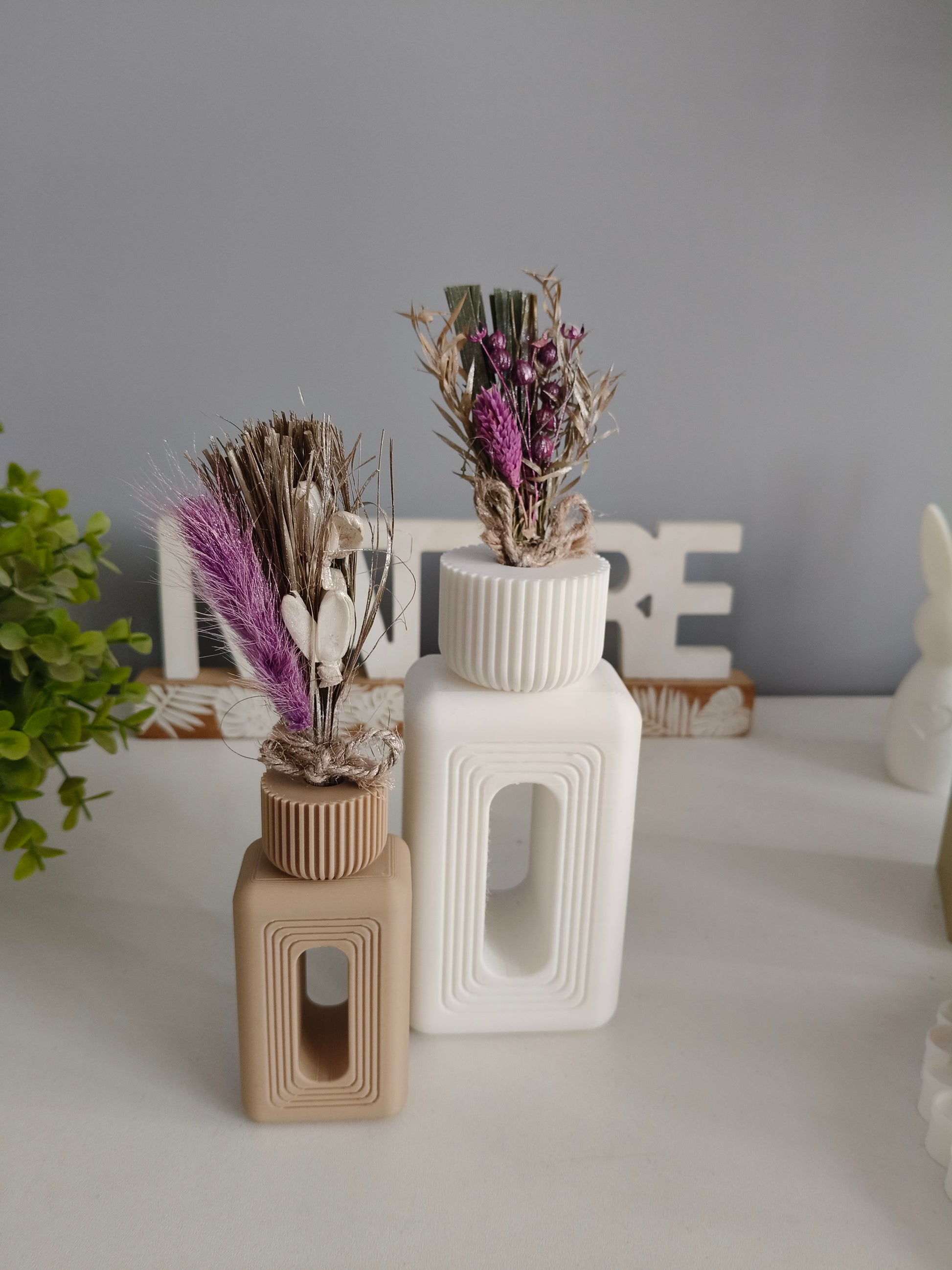 Dodaj swojemu wnętrzu nowoczesnego charakteru! Nasz duet wazonów zachwyca geometryczną formą i unikalną teksturą. Idealne do eksponowania Twoich ulubionych suszek lub gałązek. 🌿🤍